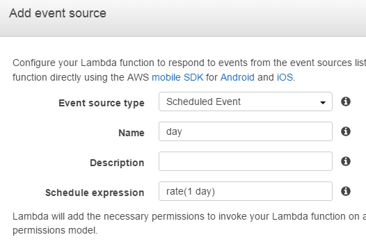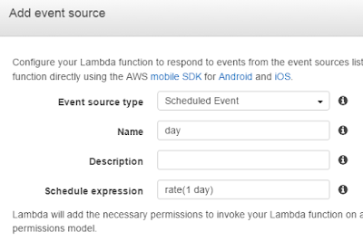 いつの間にかLambdaがスケジュール実行に対応していたので、Schedule expressionに「1 day」を指定。これでうまく動くと一番上の画像のように毎日どっかのタイミングで指定したディスクを対象としたアーカイブ処理が動きます。